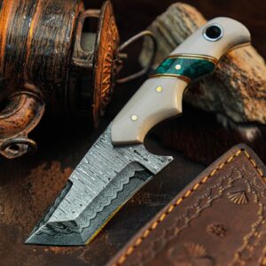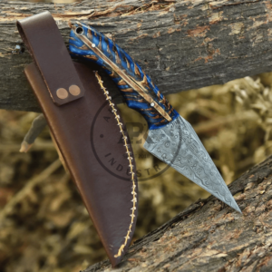 Handmade Damascus Steel Fixed Blade Knife with Resin Handle & Leather Sheath