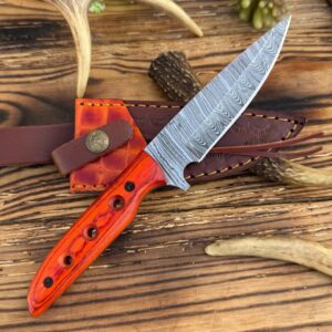 Handmade Damascus Steel Hunting Knife with Orange Wood Handle