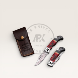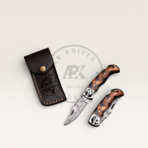 Handmade Damascus Steel Folding Knife with Leather Sheath