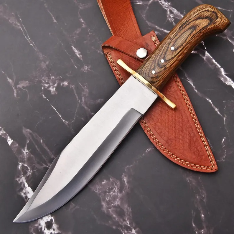 While the blade in this specific image is a mono-steel (solid satin finish), many custom versions of this Bowie knife are crafted with Damascus steel. For such a build, the specifications would include: