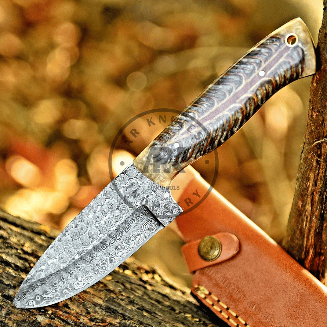 This handmade Damascus steel fixed blade knife features a distinct mosaic-style Damascus blade pattern combined with a stabilized resin handle for a modern yet traditional look. Designed for outdoor use, collectors, and private label brands, it delivers durability, balance, and premium craftsmanship.