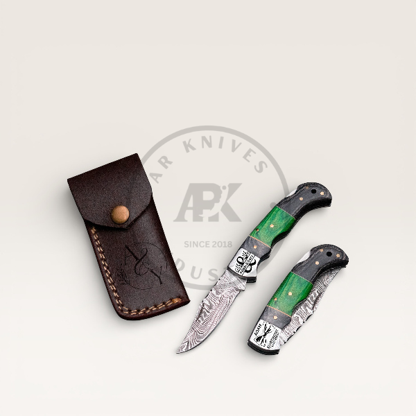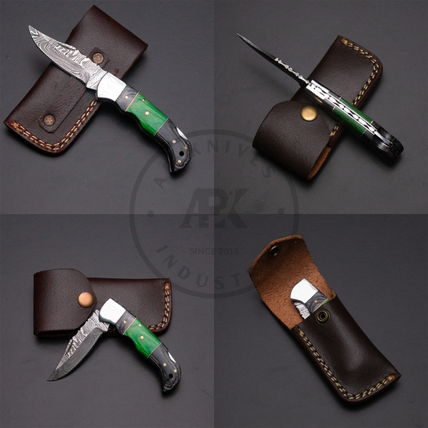 Premium handmade Damascus steel folding knife with an ergonomic multi-tone wood handle, engraved stainless bolster, and handcrafted leather sheath. Built for everyday carry (EDC), camping, hunting, and gifting.